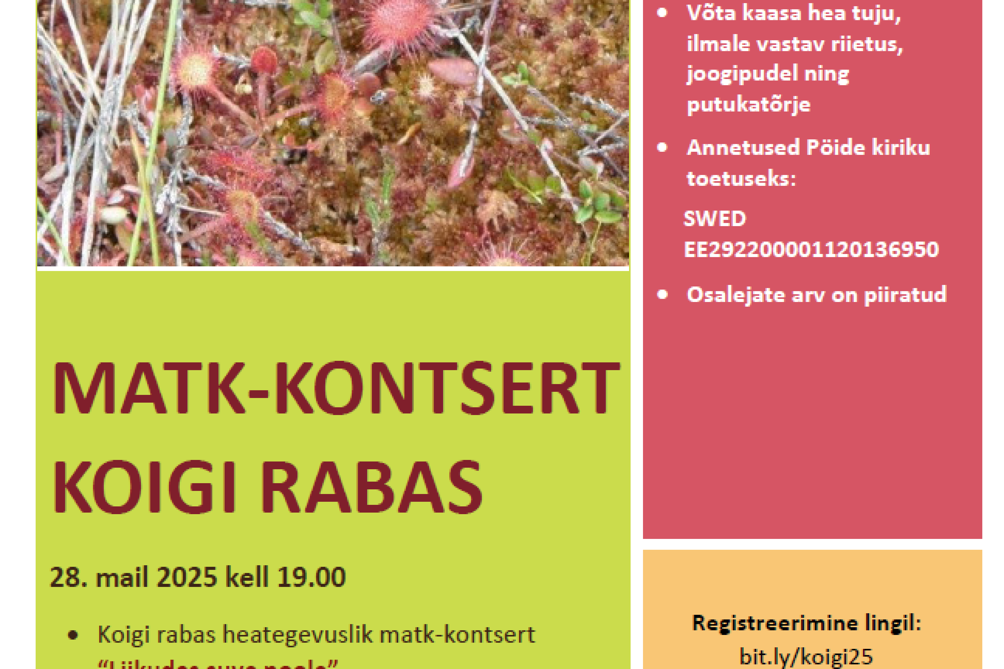 Kuressaare Ametikooli kultuurigiidi eriala õppijad korraldavad 28. mai õhtul algusega kell 18.30 Koigi rabas traditsiooniks saanud heategevusliku matk-kontserdi "Liikudes suve poole".