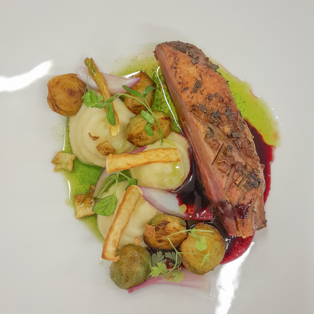 /madaltemperatuuril küpsetatud pardifilee, pirni-pastinaagipüree, grillitud rooskapsad, mustsõstra-punaseveinikaste/