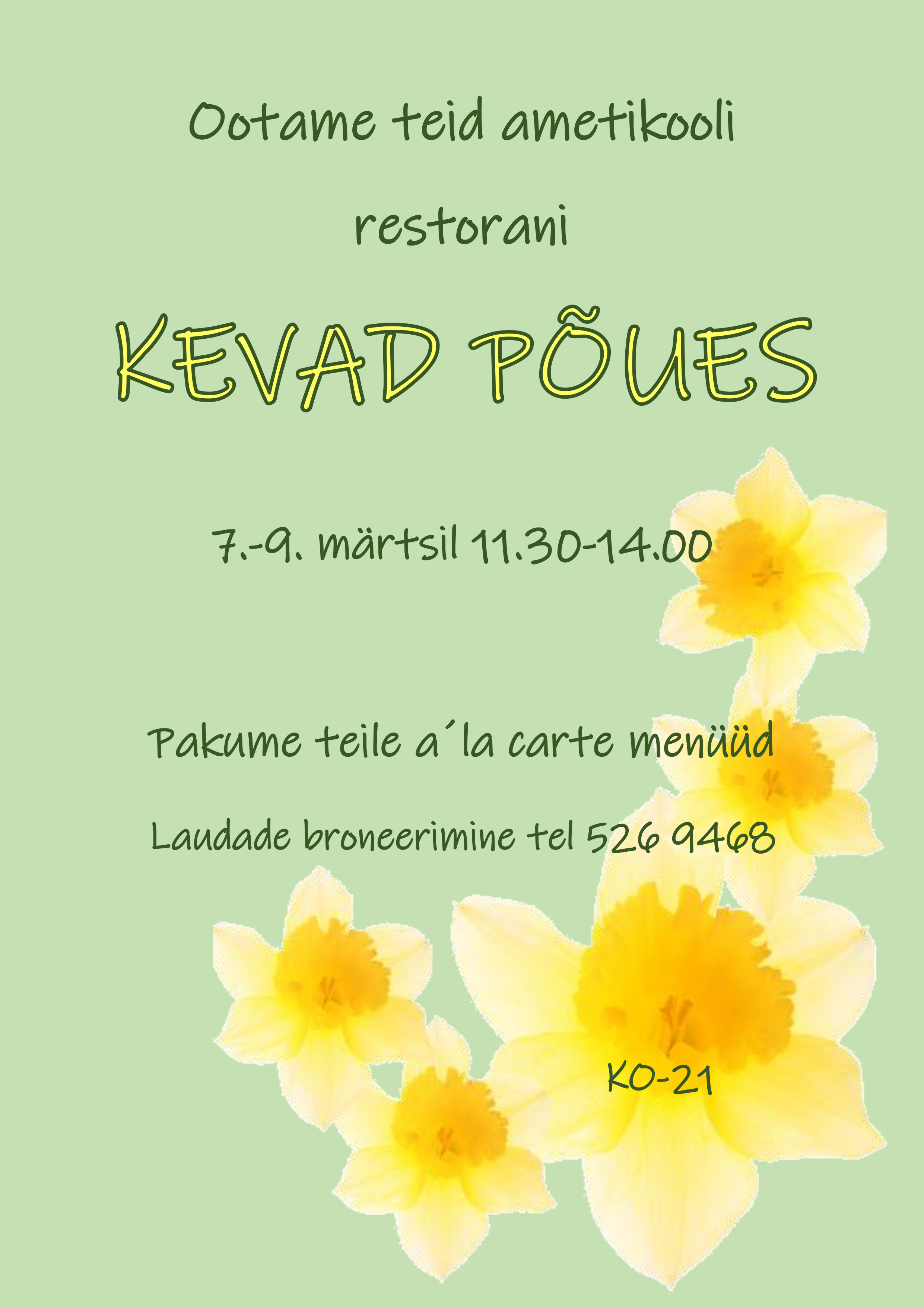 Kuressaare Ametikooli koka eriala õpilased kutsuvad nautima à la carte lõunamenüüd 7.-9. märtsil kell 11.30-14.00 kooli restoranis. Valikus imemaitsvad eel- ja pearoad, desserdid ning alkoholivabad joogid.