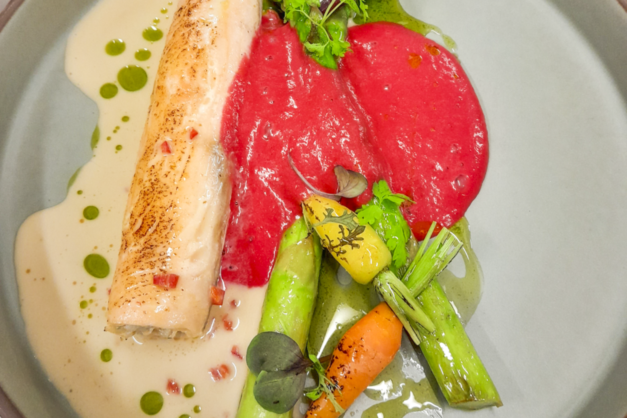 /küpsetatud lõhe-haugirull, peedipüree, miniporgand, grillitud spargel/
